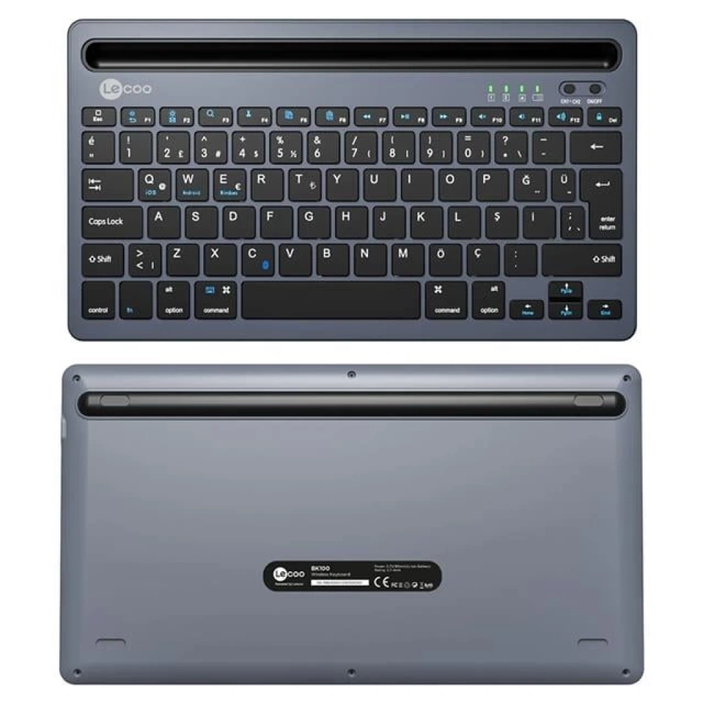 Lecoo BK100, ultra ince şık bir klavyedir ve iPad, iPhone, dizüstü bilgisayar, PC, tablet, akıllı telefon ile uyumludur. Telefonunuzu veya tabletinizi tutmak için üst kısmında bir tutucuya sahiptir. Bu bölme, telefon ve tabletlerinizi doğru açıda tutarak yazı yazarken daha rahat okumanıza olanak sağlar veya isterseniz bir stand görevi görebilir.